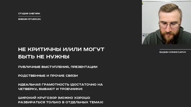 Семинар Студии Снегири для сценаристов, писателей, режиссеров, фильммейкеров — 10 навыков профессионального сценариста. Сайт студии Снегири: https://snegiri-studio.ru/head Бесплатный вводный курс в сценарное мастерство: https://snegiri-studio.ru/start Бесплатный курс: Как свой рассказ или роман превратить в киносценарий: https://snegiri-studio.ru/adaptation Базовый курс сценаристов кино и сериалов: https://snegiri-studio.ru/basic-screenwriting-course Сценарная мастерская: https://snegiri-studio.ru/scenario-studio Курс сценаристов комедии: https://snegiri-studio.ru/comedy-scriptwriting-courses Продвинутый курс сценаристов кино и сериалов: https://snegiri-studio.ru/advanced-screenwriting-course Курс сценарий короткометражного фильма: https://snegiri-studio.ru/short-film-writing-course Каталог всех курсов для сценаристов: https://snegiri-studio.ru/snegiri-studio-vse-kursy Каталог экстра-интенсивов для сценаристов: https://snegiri-studio.ru/extra-intensives-for-screenwriters Блог Студии Снегири: http://snegiri-studio.ru/blog Отзывы о Студии Снегири: https://snegiri-studio.ru/reviews Библиотека сценариев фильмов и сериалов на русском языке: https://snegiri-studio.ru/y/f55cc0a Энциклопедия начинающего сценариста: https://snegiri-studio.ru/enciklopediya-nachinayushchego-scenarista Контакты кинокомпаний, киностудий, продюсеров: https://snegiri-studio.ru/kontakty-kinostudiy-tv-prodyuserov Темы семинара: — В каких трех сферах необходимо развиваться сценаристу — Очевидные и неочевидные навыки хорошего сценариста — Как повысить шансы стать профессиональным сценаристом — Карьерные перспективы сценариста (что дальше) — Ответы на дополнительные вопросы участников семинара ==================================================== #сценарий #сценарист #карьера ===================================================== Ведет онлайн семинар: Вадим Комиссарук - креативный продюсер, сценарист, автор проектов на 1 канале, СТС, ТНТ, ПЯТНИЦА и других ===================================================== О чем это вообще: Фильммейкинг Как снимать кино Драматургия Сторителлинг Как написать сценарий Как стать сценаристом Как стать режиссером Шоураннер Киноиндустрия Киносценарий Персонаж Сценарное мастерство Путь героя Путешествие писателя Школа кино Сценарная мастерская