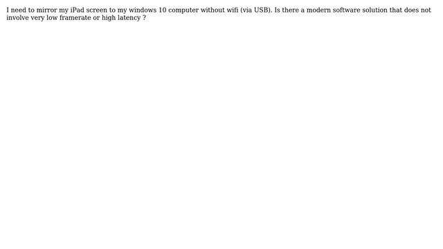 Apple: Mirror iPad Pro screen to my Windows 10 PC via USB Helpful? Please support me on Patreon: https://www.patreon.com/roelvandepaar With thanks & praise to God, and with thanks to the many people who have made this project possible! | Content (except music & images) licensed under CC BY-SA https://meta.stackexchange.com/help/licensing | Music: https://www.bensound.com/licensing | Images: https://stocksnap.io/license & others | With thanks to user W. Volante (apple.stackexchange.com/users/390546), user bmike (apple.stackexchange.com/users/5472), and the Stack Exchange Network (apple.stackexchange.com/questions/402280). Trademarks are property of their respective owners. Disclaimer: All information is provided "AS IS" without warranty of any kind. You are responsible for your own actions. Please contact me if anything is amiss at Roel D.OT VandePaar A.T gmail.com