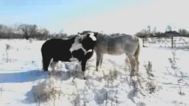 Жеребцы Аригон и Гений выясняют отношения ( по-дружески). Лошади Сабрина и Музыка с интересом наблюдают за происходящим) . В случной период эти кони дрались бы по-настоящему (так как работают вожаками в табуне), а зимой это просто знакомство и игра. #интересно #жеребец #лошади