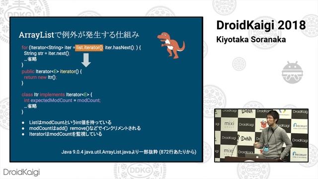 ■概要: AndroidのJavaとOracleのJavaは微妙に異なると言われていますが、普段その違いを意識することはあまりありません。 実際、「だいたいJava6ぐらいかなー」って思っていればうまくいくことが多いと思います。 そこで今回は「全く同じJavaコードを書いてもOracleのJVMとAndroid Runtimeで異なる動作をすることがある」っていうのを紹介したいと思います。 題材にするのはよく使われるArrayListです。 ■対象者: JavaでArrayListを使ったことがある。 if文やfor文、拡張for文、Iteratorなど、Javaの基本的構文を書いた or 読んだことがある。 世界にはJavaコードから生成されたプログラムを動かす実行環境がたくさんあるらしい(OracleのJVM、Dalvik仮想マシン、Android Runtime) ことを知ってる。(これを読んだあなたはもう知っているので対象者です) ■目次 ・普通に書けば、普通に同じ動作をする ・ArrayListを拡張for文で回す←ここまでは同じ ・for文中にあることをすると・・・おおっと ・大丈夫なこともある? ・なぜ大丈夫なこともあるのか? ・Javaは不思議だなぁ。AndroidもJavaだもんね、同じことが・・・ ・ピュアJavaだと思った?残念Androidでした ・AndroidはJavaとAPIが同じなだけ ~いつからAndroidをJavaだと錯覚していた?~ ・ネタばらし ・もちろん逆パターンもあるぞ ・その他の事例もあるぞ(先駆者紹介) 注意:このセッションは好奇心を満たすだけで、明日使えるテクニックは何もありません ---------------------------------------------------------------------------------------------------------------- DroidKaigiはエンジニアが主役のAndroidカンファレンスです。 Android技術情報の共有とコミュニケーションを目的に、2018年2月8日(木)、9日(金)の2日間開催しました。 今回は「ニッチな技術とコミュニケーション」を重視しました。 DroidKaigi is a developer-first Android conference. Our objectives are to help Android developers to share knowledge about Android development and connect with other Android developers. The conference will be held on 8th - 9th February 2018 with "Niche Technology and Communication" as the main theme. DroidKaigi 2018 - https://droidkaigi.jp/2018/ DroidKaigi 2017 - https://droidkaigi.github.io/2017/ DroidKaigi 2016 - https://droidkaigi.github.io/2016/ DroidKaigi 2015 - https://droidkaigi.github.io/2015/ DroidKaigi Twitter - https://twitter.com/droidkaigi