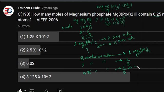 How many moles of Magnesium Phosphate Mg3(PO4)2 will contain 0.25 moles of Oxygen atoms? In this informative video, we explore a stoichiometry problem involving Magnesium Phosphate (Mg3(PO4)2) and Oxygen atoms. We'll tackle the question of how many moles of Magnesium Phosphate are required to contain 0.25 moles of Oxygen atoms. Stoichiometry is a critical concept in chemistry that deals with the quantitative relationships between reactants and products in a chemical reaction. This lecture deals with: magnesium phosphate , mg3po42, mole concept based numericals, mole, concept basic calculation, mole concept based questions, mole concept, basic chemistry, mole concept based problems, moles, mole concept class 11, mole concept basic class 11, mole concept jee, mole concept jee mains, mole concept jee mains pyq, mole concept jee pyq, mole concept neet, mole concept neet questions practice, mole concept neet class 11, mole concept class 11 neet in hindi , mole concept class 11 neet in hindi PYQ JEE/NEET Playlist: https://www.youtube.com/playlist?list=PLk6fEpFQTAEKRrHkVKUKxY6_fnY6hi5KK For more engaging chemistry tutorials and problem-solving techniques, don't forget to subscribe to our channel and hit the like button if you find this video helpful. Get ready to master stoichiometry and expand your knowledge of chemistry in a fun and educational way! #MagnesiumPhosphate #Mg3PO4 #Moles #MoleConcept #Class11 #MoleConceptBasic #MoleConceptBasicClass11 #MoleConceptNumericals #MoleConceptCalculation #MoleConceptQuestions #BasicChemistry #MoleConceptProblems #JEE #JEEMains #JEEMainsPYQ #JEEMoleConcept #NEET #NEETPractice #NEETClass11 #NEETinHindi #Class11NEET #HindiNEET #ChemistryTutorial #Stoichiometry #ChemistryProblems #ChemistryExam #ChemistryPreparation