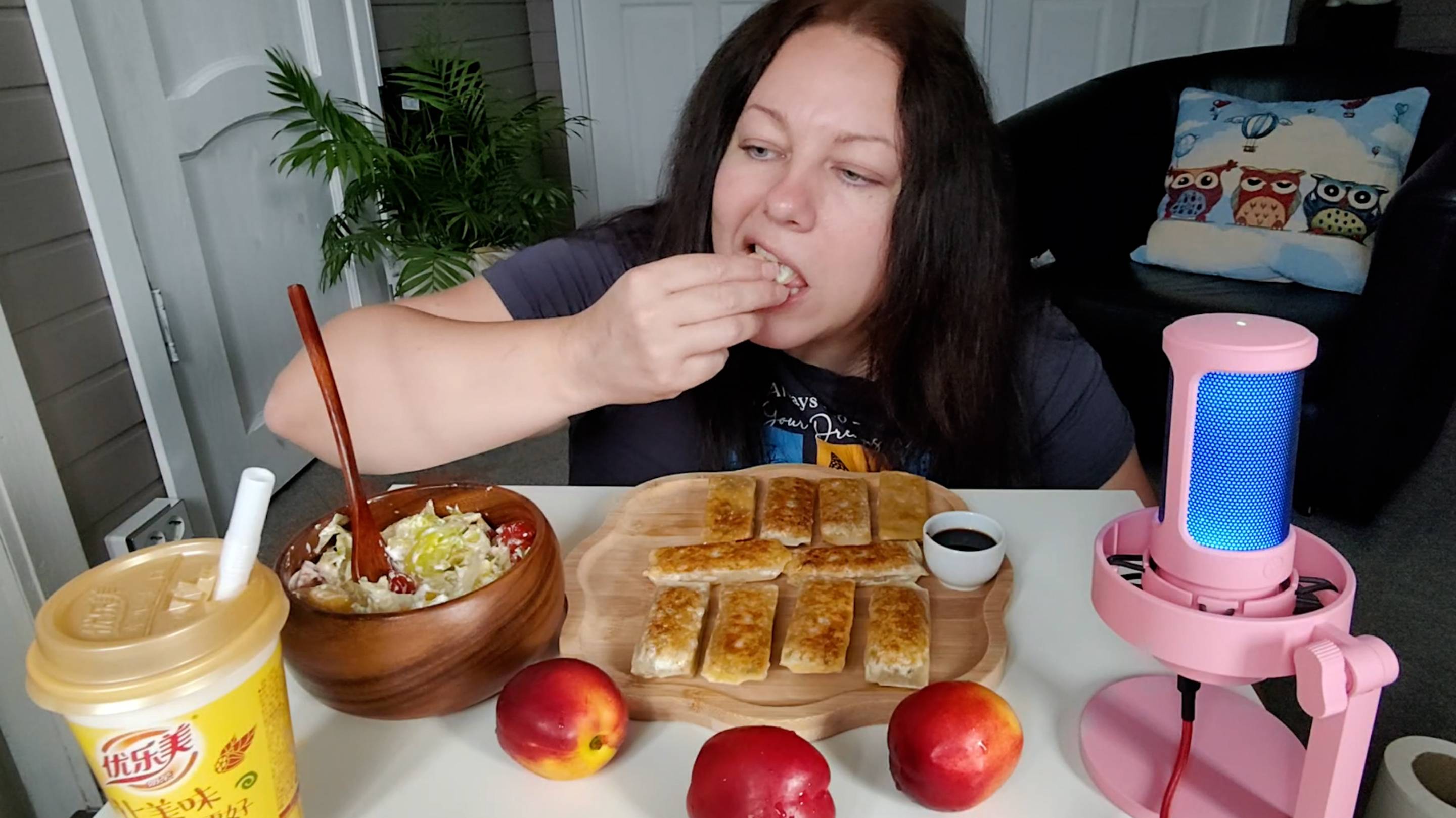Мукбанг Дамплинги жареные, салат Овощной с сиртаки, Милк Ти с мармеладками и шоколадом.