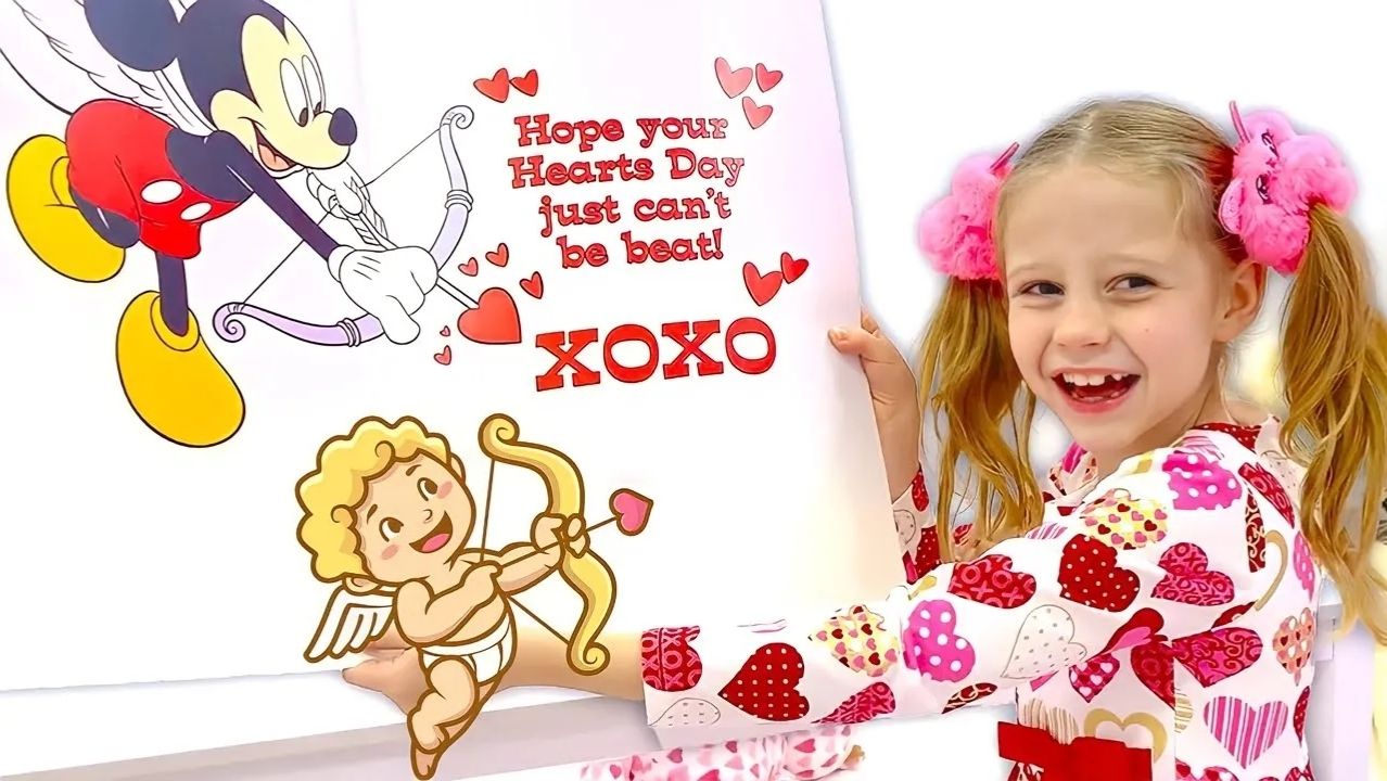 Настя дарит подарки своим друзьям на День святого Валентина.