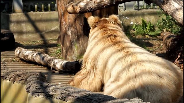 Белокоготный медведь Карат с аппетитом жуёт замороженное лакомство. Для медведей готовят специальное порционное мороженое - в брикет закладывают рыбу, овощи или фрукты и заливают водой. В замороженном виде еду отдают медведям. Каждый с угощением расправляется по своему - одни медведи ждут, когда лёд подтает, а другие грызут прямо так, ведь мощные челюсти позволяют без проблем откусывать ледяные куски.