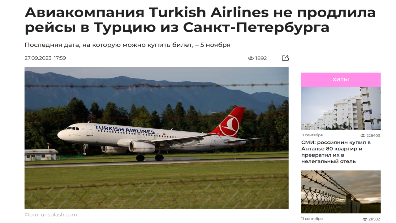 Новости туризма 27/09/2023 Авиакомпания Turkish Airlines не продлила рейсы в Турцию из СПБ #туризм