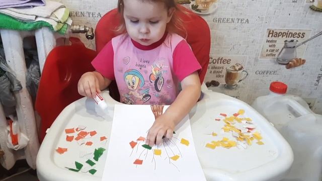 Настя учится клеить.Клеим осенние листочки на дерево.