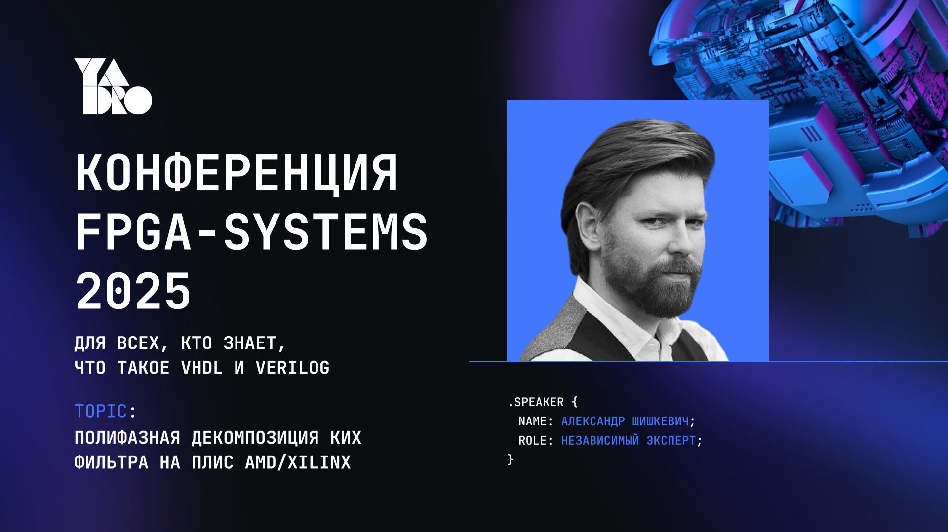 Спикер: Александр Шишкевич, ведущий инженер по программированию ПЛИС (ЦОС), независимый эксперт. Есть опыт в области радиосвязи, видеообработки и системном управлении. Александр участвовал во всех циклах разработки и изготовления продукции (от ТЗ до ПСИ) в роли схемотехники, тополога и FPGA-разработчика. В настоящее время сосредоточен на аппаратном прототипировании исследовательских задач. Тема: Полифазная декомпозиция КИХ-фильтра на ПЛИС AMD/Xilinx. Полифазную декомпозицию применяют в задачах цифровой обработки широкополосных сигналов, когда полоса сигнала превышает предельную тактовую частоту аппаратной платформы. В докладе рассмотрели различные реализации полифазной декомпозиции КИХ фильтра и оценили, для каких случаев каждая из них станет наилучшим выбором.