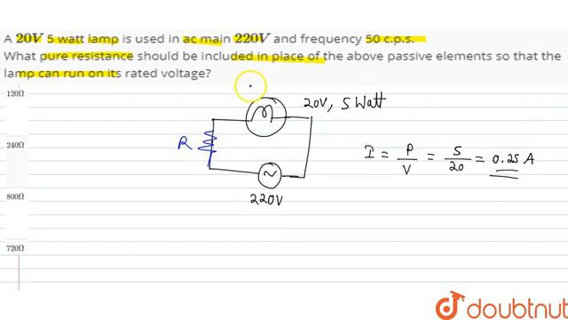 A `20 V` 5 watt lamp is used in ac main `220 V` and frequency 50 c.p.s. What pure resistance