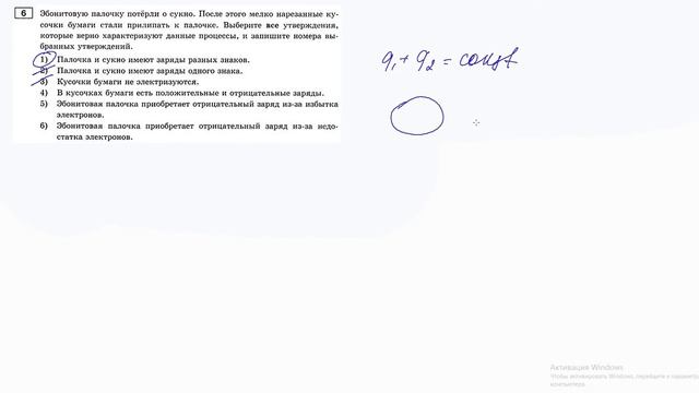 Эбонитовую палочку потёрли о сукно. После этого мелко нарезанные кусочки бумаги стали прилипать к палочке. Выберите все утверждения, которые верно характеризуют данные процессы, и запишите номера выбранных утверждений. 1) Палочка и сукно имеют заряды разных знаков. 2) Палочка и сукно имеют заряды одного знака. 3) Кусочки бумаги не электризуются. 4) В кусочках бумаги есть положительные и отрицательные заряды. 5) Эбонитовая палочка приобретает отрицательный заряд из-за избытка электронов. 6) Эбонитовая палочка приобретает отрицательный заряд из-за недостатка электронов.