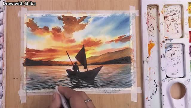 Мастер-класс по рисованию акварелью заката на берегу реки. Просто.