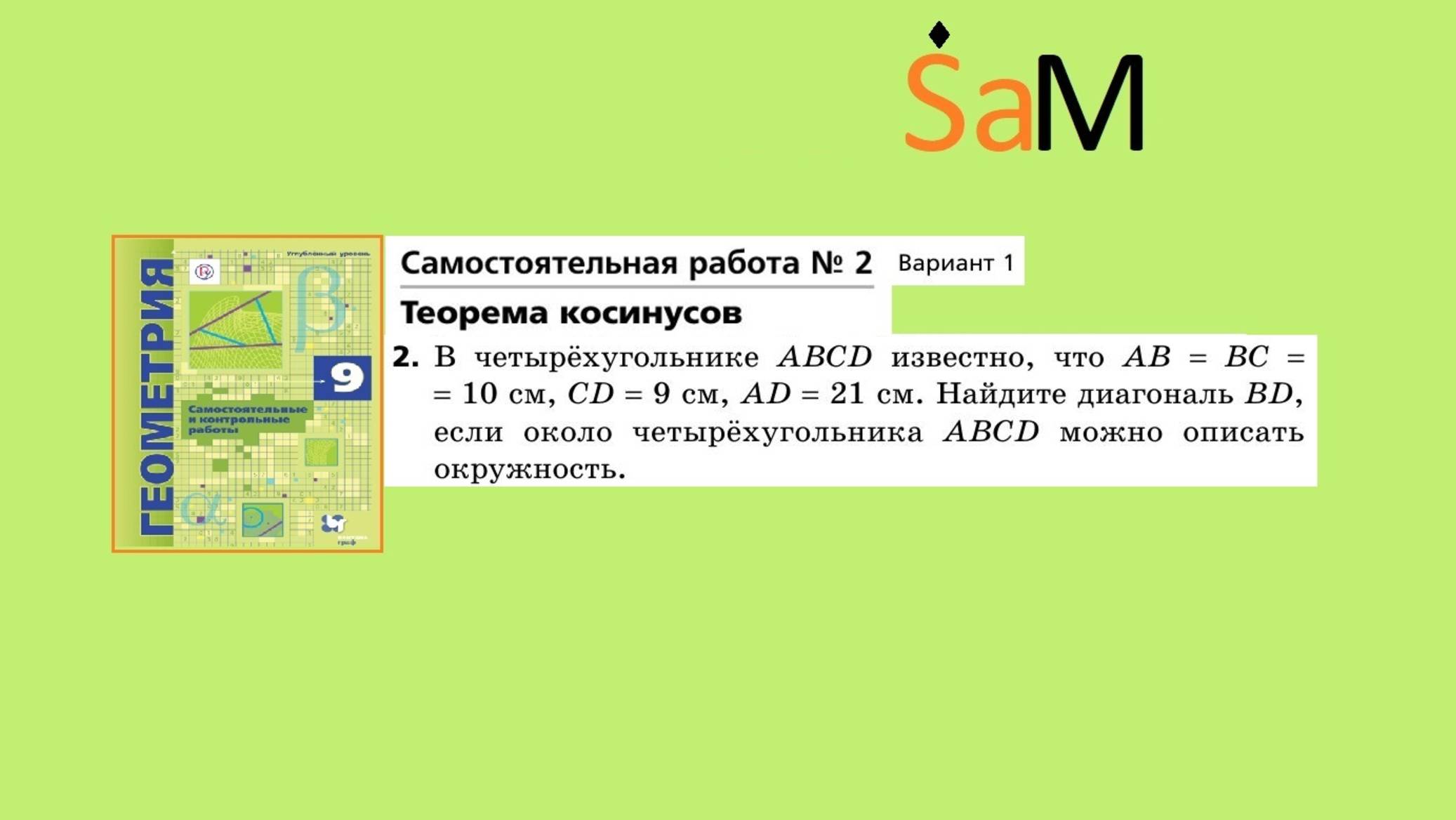 Мой канал Дзен: https://dzen.ru/saintmath Задания в письменной форме вы сможете найти там Мой канал на Vkвидео: https://vkvideo.ru/@club231069125 Геометрия 9 класс. Углубленный уровень. Мерзляк. Самостоятельная работа 2. Вариант 1. Задание 2 ТЕОРЕМА КОСИНУСОВ. 2. В четырёхугольнике ABCD известно, что АВ=ВС=10 см, CD=9 см, AD= 21 см. Найдите диагональ ВD, если около четырёхугольника ABCD можно описать окружность. Подпишись, чтобы Sam благословил тебя на самостоятельную ❤️