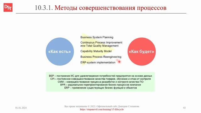 Словарь «Термины и определения корпоративных информационных систем и ERP-систем». Ключевые слова: оптимизация процессов, совершенствование процессов, BSP, CPI, TQM, CMM, BPR, ERP. Ссылка: https://stepanovd.com/training/15-lifecycle