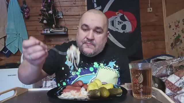 почти новогодний мукбанг - квашеная капуста, бочковые огурцы, картошка, сосиски, стакан портвейна