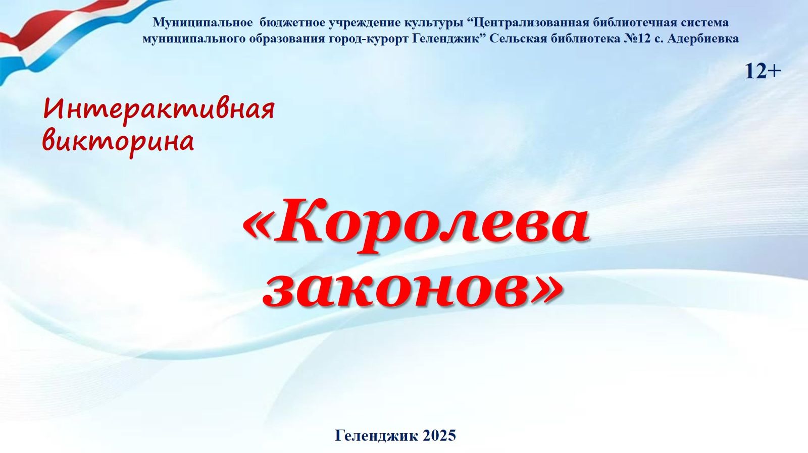 День Конституции Российской Федерации, который отмечается ежегодно 12 декабря – одна из значимых памятных дат Российского государства. Для своих читателей Сельская библиотека №12 с. Адербиевка подготовила интерактивную викторину «Королева законов», цель которой - обновить знания о Конституции РФ, государственном устройстве страны. Итоги викторины покажут, пополнился ли у участников багаж знаний о своих правах и обязанностях, научились ли они ориентироваться в бескрайнем море норм и правил поведения. Для ответов на вопросы ребятам потребуется не только знание основ права, но и смекалка. #ЧитающийГеленджик, #БиблиотекиГеленджика