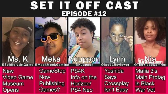 Welcome to the 12th episode of the Set it Off Cast! TOPICS: Grand Opening of the National Videogame Museum http://equityarcade.com/2016/04/05/the-grand-opening-of-the-national-videogame-museum/ GameSop Starts New Publishing Arms: GameTrust http://xboxenthusiast.com/news/gamestop-starts-new-publishing-arm-gametrust/ Playstation 4K Evolves? "NEO"? http://www.forbes.com/sites/davidthier/2016/04/19/sonys-upgraded-ps4-would-make-fans-furious-neo-4k-ps4k-ps4-5 #542bc62875a1 Yoshida Explains Cross-Nework Play Isn't Easy http://savage-gamers.blogspot.ca/2016/04/sony-president-explains-why-ps4-and.html?spref=fb&m=1 Marfia 3's MC is a Black Vietname War Vet in 1960s New Orleans http://www.gamespot.com/articles/mafia-3-casts-you-as-a-black-vietnam-war-veteran-i/1100-6429476/ [MOVIE/TV TOPIC] Fist Look at "Ghost in the Shell" Casting http://moviepilot.com/posts/3868735?utm_source=fb-stream-post&utm_medium=facebook&utm_campaign=manga-madness-first-look-at-scarlett-johansson-in-the-ghost-in-the-shell Constance Wu & Ming-Na Wen Protest Hollywood's Whitewashing https://www.buzzfeed.com/susancheng/constance-wu-mingna-wen-urge-asian-americans-to-fight-bac #.gwvAnA1Am9 [ANNOUNCEMENTS] Microsoft Will Halt Production of Xbox360 http://www.cbc.ca/news/business/microsoft-xbox-1.3544766 Mirrors Edge Catalyst Delayed Until June http://www.theverge.com/2016/4/21/11479422/mirrors-edge-catalyst-june-delay Gears of War 4 Ultimate Edition w/ Early Access http://www.purexbox.com/news/2016/04/gears_of_war_4s_ultimate_edition_will_let_you_play_the_game_early Horizon Zero Dawn 2017 Launce "Neo Mode"? http://www.express.co.uk/entertainment/gaming/663306/Horizon-Zero-Dawn-release-date-PS4-update-2017-launch Nintendo Humble Bundle Pack https://www.humblebundle.com/friends-of-nintendo-3ds-wiiu Share this with your pals! :D ***Where to find me*** Facebook: https://www.facebook.com/thevideogamh... Twitter: http://www.twitter.com/TheVideoGamHer Twitch: http://www.twitch.tv/NiaLovesNinty Miiverse: TheVideoGamHer or TVGonYT (alternate) Discord: https://discord.gg/0RDWKm9b6yApn7OZ Gamers Gonna Game Community: https://www.facebook.com/groups/98318... and https://www.youtube.com/watch?v=Dumx8... Intro Theme: Metroid Hip Hop Beat Samus Intro Fanfare Artist: Michael Chitwood Original Tune: https://www.youtube.com/watch?v=xjruQ... ---------------------------------------------------------------------------------- Check out and support my website! We're growing. Help us continue to grow! :D Website: http://SheAttack.com. Facebook Fan Page: https://www.facebook.com/SheAttack Facebook Group: https://www.facebook.com/groups/sheat... Twitter: https://twitter.com/SheAttack Instagram: https://www.instagram.com/SheAttack YouTube: http://www.youtube.com/user/sheattacktv Pintrest: http://www.pinterest.com/sheattack/ Google+: https://plus.google.com/u/0/112746351... Twitch: http://www.twitch.tv/sheattack Tumblr: http://sheattack.tumblr.com/ Patreon: http://www.patreon.com/SheAttack