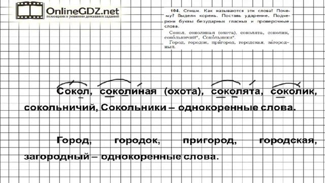 Другие решения смотри тут: https://urokitv.net/15-russkiy-yazyk-3-klass-buneev-r-n-buneeva-e-v-pronina-o-v Urokitv.net это школьные учебники и решебники с 1-го по 11-й класс школы. Ждем ваших предложений и пожеланий. Если вам нравится, то что мы делаем расскажите про нас своим друзьям и одноклассникам. Для выполнения задания из 104 упражнения следует списать слова, выяснить, как они называются и почему. Затем выделить в словах корень, поставить ударение и подчеркнуть безударные гласные. Если вы хотите выполнить это задание быстро и без ошибок, мы рекомендуем к просмотру наше видео! Упражнение 104 — Русский язык 3 класс (Бунеев Р.Н., Бунеева Е.В., Пронина О.В.) Часть 1