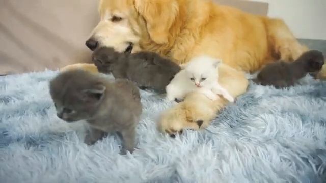 Золотистый ретривер пытается заменить кошку-маму и позаботиться о котятах - 2025 год