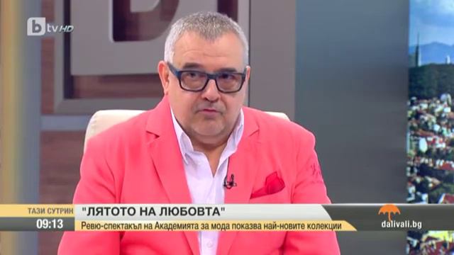 Проф. Любомир Стойков издава в аванс какво ще се случи на ревю-спектакъла на Академията за мода "Лятото на любвта" (Red Fashion Party) и коментира детайли от събитието, в което ще участват успешни и изтъкнати наши и чуждестранни дизайнери, модни къщи и брандове. Сред тях са: носителите на приза “Златна игла” на Академията за мода: Албена Александрова, Вяра Георгиева, Евгения Живкова, Жана Жекова, Йорданка Чернаева, Мариела Гемишева, Меги Петкова, Николай Божилов, Светослав Колчагов, София Борисова, Теодора Спасова и Христина Ангелова. Своите най-нови колекции ще покажатDesizo Monni, Иван Донев и Христо Чучев, Axel Hardy, Bra Clinic, Десислава Дамянова и Никола Карадамянов за Banderol, Versace 19.69 Abbigliamento Sportivo Srl, както и Мерлин Арно – носител на Златна игла 2017. Специален гост на ревю-спектакъла ще бъде италианският дизайнер Алберто Веделаго. В ревю-спектакъла ще участва и актрисата Борислава Стратиева (в тоалет на Вяра Георгиева – Феде фешън студио), която бе сред най-добре облечените знаменитости на червения килим в Кан, според класацията на прочутото лайфстайл списание „Венити феър“. Тематични аутфити, съобразени с дрескода „червено“ ще представят студенти по мода на проф. Любомир Стойков от специалността "Мода" на Националната художествена академия. Водеща на червеното модно парти ще бъде Гери Дончева в тоалет на Христо Чучев. Излъчено в предаването "Тази сутрин" по bTV с водещ Антон Хекимян на 14 юни 2017 г.