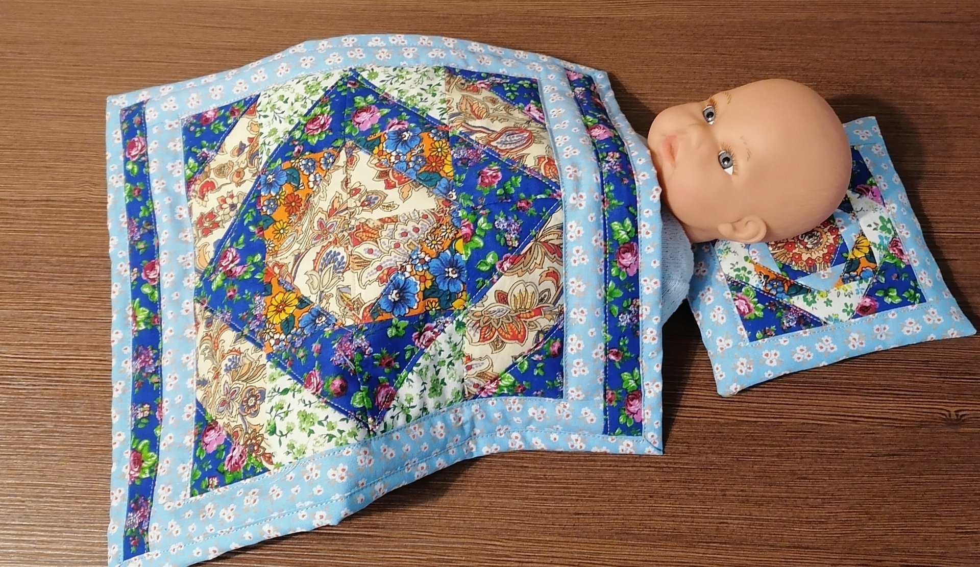 Лоскутное шитье. Одеяло и подушка для куклы.