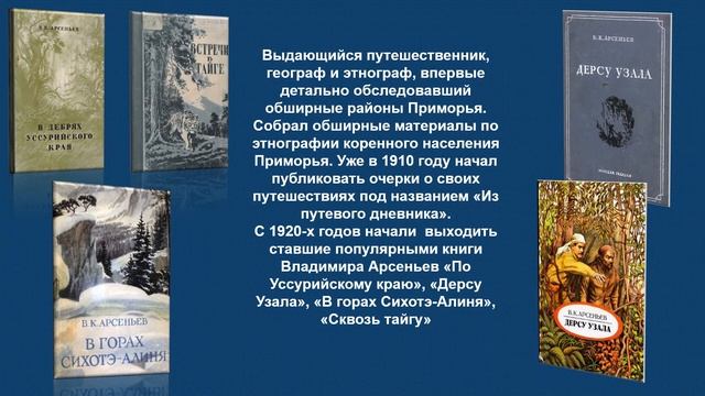 О жизни и творчестве Владимира Клавдиевича Арсеньева,русского путешественника, географа, этнографа, писателя, исследователя Дальнего Востока.