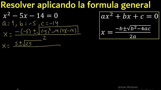 x^2-5x-14=0 Formula general a una ecuacion cuadratica ( 2 grado ) , solucion procedimiento