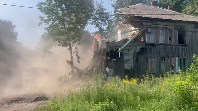 На месте работают один экскаватор и пять самосвалов. На снос барака потребуется два дня.