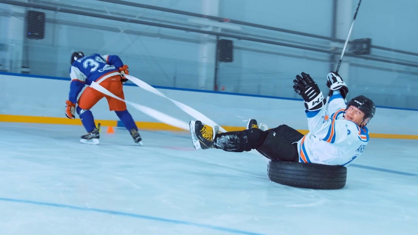 Первая тренировка Андрея и Владимира, в конце которой они сыграют против 12-летних спортсменов из школы ЦСКА. Также их ждет два челленджа. Первый — специально разработанная хоккейная полоса препятствий, чтобы фиксировать прогресс. Во втором челлендже Андрей и Владимир будут бегать по льду от профессионального хоккеиста в ростовом костюме быка, который попытается их осалить.
