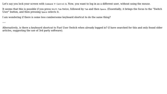 Apple: Is there a shortcut to "Switch User" from the Lock Screen in macOS Mojave? Helpful? Please support me on Patreon: https://www.patreon.com/roelvandepaar With thanks & praise to God, and with thanks to the many people who have made this project possible! | Content (except music & images) licensed under CC BY-SA https://meta.stackexchange.com/help/licensing | Music: https://www.bensound.com/licensing | Images: https://stocksnap.io/license & others | With thanks to user Nimesh Neema (apple.stackexchange.com/users/279727), user FiddleDeDee (apple.stackexchange.com/users/188402), user chaimp (apple.stackexchange.com/users/100603), and the Stack Exchange Network (apple.stackexchange.com/questions/362668). Trademarks are property of their respective owners. Disclaimer: All information is provided "AS IS" without warranty of any kind. You are responsible for your own actions. Please contact me if anything is amiss at Roel D.OT VandePaar A.T gmail.com