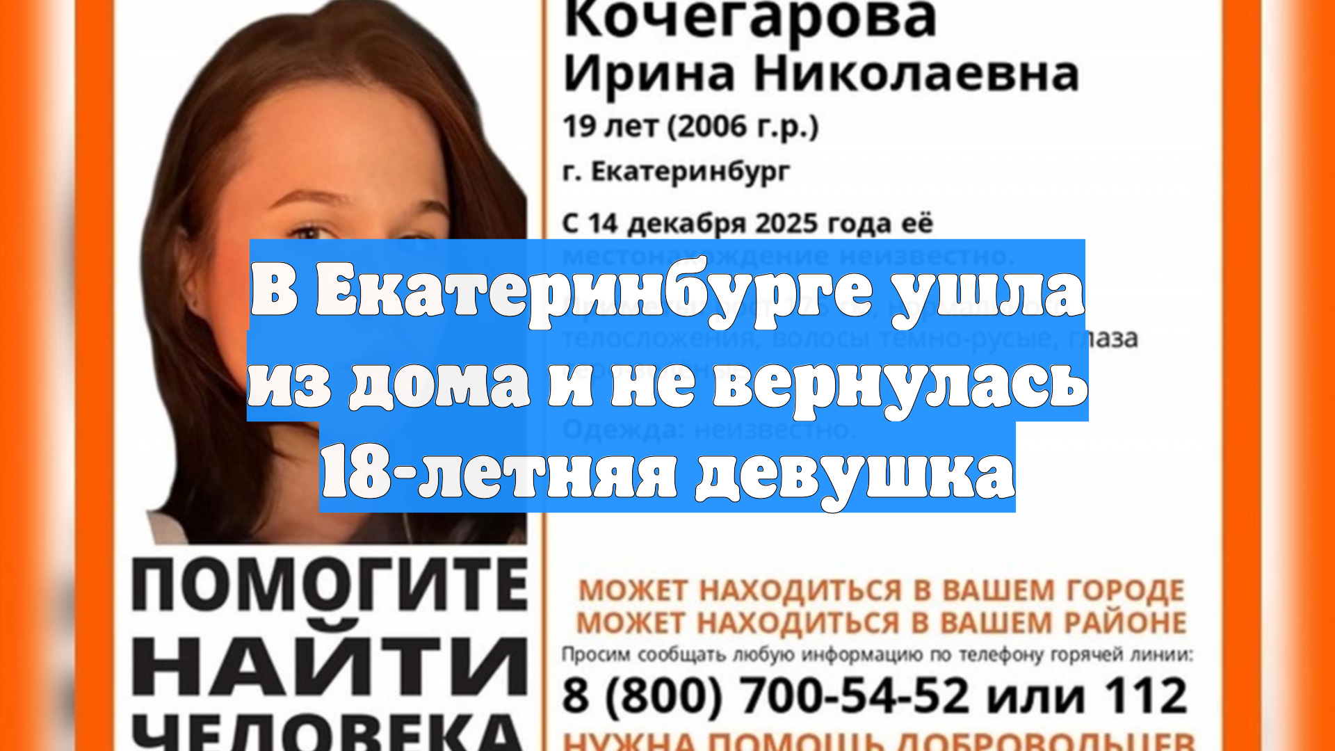 В Екатеринбурге разыскивают 18-летнюю девушку, которая пропала после выхода из дома 16 декабря.