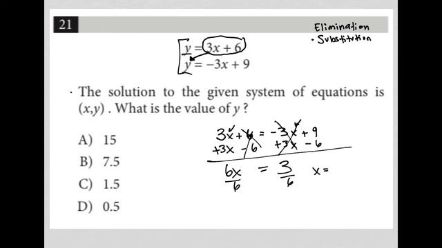 Official October 2022 SAT Section 4 Question 21: y = 3x + 6; y = -3x + 9. The solution to the given system of equations is (x,y). What is the value of y ?