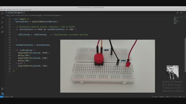 Rutube задача: https://rutube.ru/video/9305d15b40c0c1ddbd9bad54d4ecff50/ 47. Мигающий светодиод с кнопкой. Используйте кнопку для управления миганием светодиода. При нажатии кнопки светодиод начинает мигать, при повторном нажатии — останавливается. Используйте флаг lastButtonState, чтобы понимать отпущена ли кнопка или всё еще удерживается. Используйте флаг isBlinking, чтобы переключать состояние мигания. Подсказки: - Реализовать мигание светодиода с определённым интервалом (например, 200 мс или меньше). - Переключать состояние мигания при помощи флага isBlinking - если true, то мигаем. Если false - отключен. - Этот флаг изменяется при нажатии кнопки. - Настроить кнопку для определения нажатия. Понадобится флаг lastButtonState - чтобы понимать, что кнопка изменяла флаг isBlinking только один раз за нажатие. Переключаем состояние isBlinking. Перезаписываем флаг lastButtonState. Т.к используется delay(200); то физически необходимо держать кнопку нажатой 400 мс минимум для отключения. 47_button_led_toggle Весь код "Arduino Starter Kit задачи для начинающих (Набор Ардуино)" с задачами и ответами: https://gitflic.ru/project/lashko_ag/arduino-starter-kit-zadachi-dlya-nachinaushchih-nabor-arduino Telegram-группа: https://t.me/arduino_starter_kit Rutube плейлист Arduino Starter Kit: задачи для начинающих (Набор Ардуино): https://studio.rutube.ru/playlist/1196693 Rutube плейлист Arduino Starter Kit: ответы на задачи (Набор Ардуино): https://studio.rutube.ru/playlist/1196692 #Arduino #StarterKit #НаборАрдуино #ОбучениеArduino #Программирование #ОбучениеПрограммированию #КурсыArduino #ПрограммированиеДляНачинающих #lashko #АлексейЛашко
