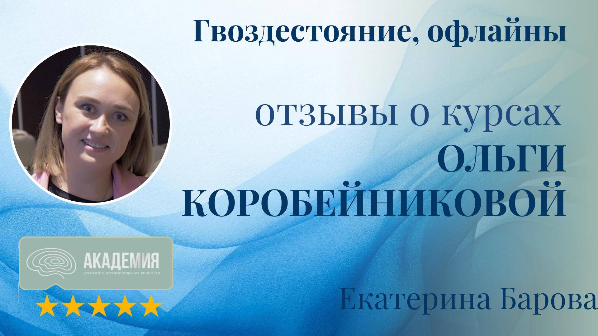 Отзывы о курсах Ольги Коробейниковой: "Гвоздестояние", офлайн-сессии 40. Екатерина Барова - Курсы: Гвоздестояние, офлайн-сессии Екатерина рекомендует Академию тем, кто переживает трудные моменты и нуждается в поддержке и ответах. Участие в курсах Ольги помогает обрести круг друзей и единомышленников. - Точка А: Начало пути Екатерина обратилась за помощью в Академию, находясь в опустошенном состоянии после развода, с маленьким ребенком на руках, без работы и самореализации, и с очень низкой самооценкой. - Путь к изменениям Следуя рекомендациям Ольги, Екатерина смогла начать двигаться к своим целям и даже переехать в город своей мечты. - Точка Б: Результаты после курсов Ольги Коробейниковой Екатерина нашла работу своей мечты, обрела новых друзей и единомышленников и вышла из подавленного состояния в состояние подъема. Отзывы о курсах Ольги Коробейниковой подтверждают, что такие программы, как "Астрогенетика" и офлайн-сессии, помогают участникам найти свое предназначение и реализовать стремление делать что-то значимое для окружающих.