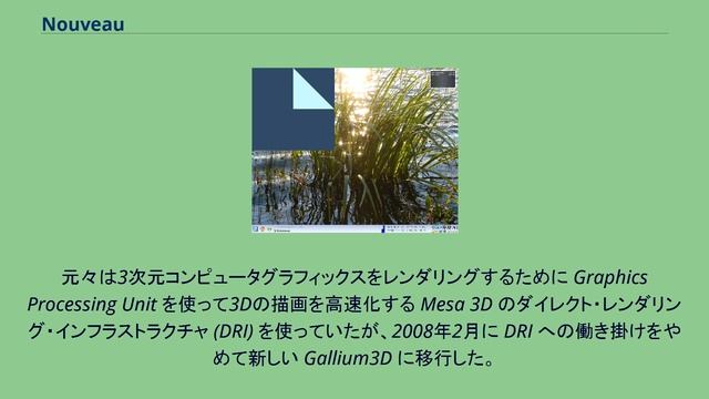 Nouveau, by Wikipedia https://ja.wikipedia.org/wiki?curid=1483941 / CC BY SA 3.0 #デバイスドライバ #Freedesktop.org Mesa /DRI and Gallium3D have different driver models. Both share a lot of free and open-source code Illustration of the Linux graphics stack An possible example matrix when implementing the Gallium3D driver model. Through the introduction of the Gallium3D Tracker Interface and the Gallium3D WinSys Interface, only 18 instead of 36 modules are required. Each WinSys module can work with each Gallium3D device driver module and with each State Tracker module. nouveau(ヌーヴォー)は X.Org Foundation と freedesktop.org のプロジェクトである。 当初は、フリーでオープンソースではあるが、ソースコードがややこしく2D機能のみの "nv" ドライバーに基づくものだった。 現在はNVIDIAのプロプライエタリなLinux用ドライバをリバースエンジニアリングして、 NVIDIAのビデオカード用のフリーなドライバを開発することを狙いとしている。 X.Org 用の他の3Dグラフィックスドライバのように、nouveau はモジュールとして実装され MIT ライセンスのもとで配布されている。 元々は3次元コンピュータグラフィックスをレンダリングするために Graphics Processing Unit を使って3Dの描画を高速化する Mesa 3D のダイレクト・レンダリング・インフラストラクチャ (DRI) を使っていたが、2008年2月に DRI への働き掛けをやめて新しい Gallium3D に移行した。 リバースエンジニアリングのためプロジェクトでは mmio-trace や REnouveau のようないくつかの特別なツールを利用している。 動作している REnouveau のスクリーンショット(REnouveau は左上の角の青いウィンドウ) REnouveauはほとんどのリバースエンジニアリングの作業を支えている。 プロプライエタリなNVIDIAのドライバを持っているユーザはNVIDIAカードのハードウェア情報を提供することでnouveauの開発を助けることができる。 これはコンピュータ上でREnouveauを動作させることによって行なわれる。 REnouveauは現在のグラフィックカードのMMIOレジスタ空間をコピーし、グラフィックの一部を描画し MMIOのもう一つのコピーを取り、違いをテキストファイルに出力することにより動作する。 コンピュータのユーザはREnouveauで70強の異なるテストを走らせ、tar.bz2のアーカイブを作ってメールで送信する。 自動的に送信したアーカイブはプロジェクトのFTPサーバに送られ、開発者がそれを解析する。 REnouveauはGPLのもとで配布されておりSDLのレンダリング技術を基にしている。