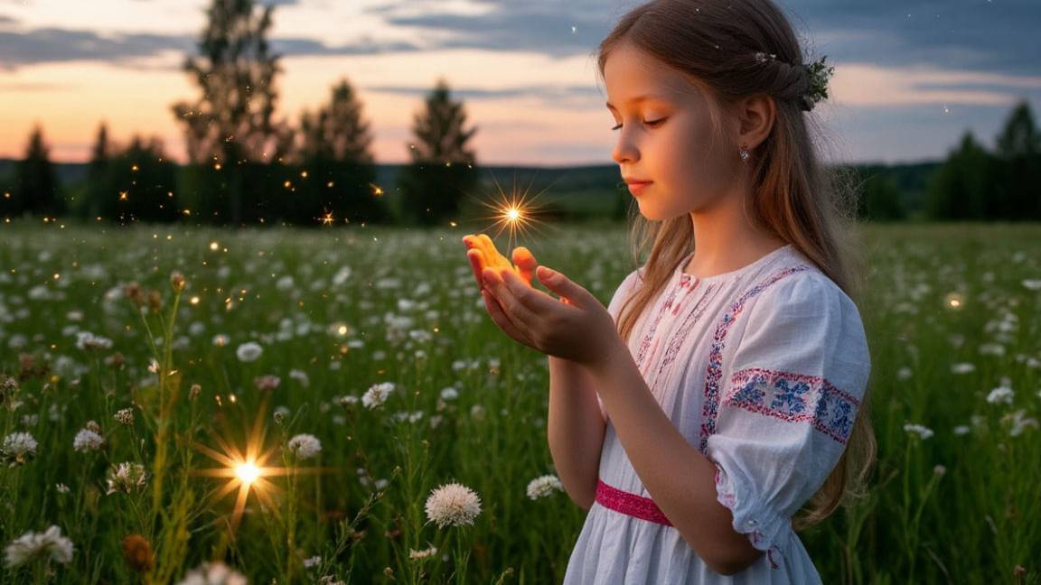 На Ивана на Купала Мама доченьку купала, Приговаривала, Заговаривала, Как ты вырастешь большой, То полюбишь всей Душой Добра молодца Ивана, Выйдешь, дочка, замуж рано За лихого атамана, За кудрявого Ивана. На Ивана да Купала Подросла, невестой стала, Расцвела, как маков цвет В восемнадцать юных лет, Повстречала у крыльца Удалого молодца. Как взглянула на Ивана, Стала молодцу желанна, Полюбилась парню Анна, Влюблена она в Ивана. На Ивана на Купала С неба звёздочка упала, Где упала, угадай И желанье загадай! Соберу в лугах цветов Да пришлю к тебе сватов И спросили сваты: "Анна, Выйдешь замуж за Ивана? Будешь ли жена названна Ты для молодца Ивана? На Ивана на Купала В речку Аннушка бросала Полевых цветов венок. Будет дочка иль сынок? Приговаривала, Заговаривала, Если дочка, то краса, В пояс длинная коса, Назову её Светлана, Подарю дочь для Ивана. На Ивана на Купала, Анна ленты покупала, Заплетала их в венок, А родится вдруг сынок, Назову его Иваном, Будет сыном мне желанным И подмогой для отца. Повенчались. Два кольца - Вот сюжет мой для романа. Счастья вам, Иван и Анна! ©Сергей Весенин #стихиотавтора