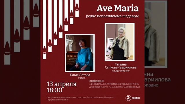 "Аве Мария. Редкоисполняемые шедевры" Исполнители лауреат всероссийских и международного конкурсов, солистка Москонцерта Татьяна Сучкова-Гавриилова (меццо-сопрано) и лауреат премии Органист года 2022 Юлия Лотова (орган) I. S. Bach (1685-1750) Фантазия C-moll BWV 562 Г.Форе (1845-1924) En Priere (Молитва) A. Дворжак(1841-1904). Ave Maris Stella. P. Tosti. Ave Maria ( Piccola melodia) Ж. Боннэ. Эльфы Л.Вьерн(1870-1937). Ave Maria К. Сен-Санс(1853-1921). Ave Maria Дж. Верди(1813-1901). Ave Maria Ж. Лангле(1907-1991). Песнь мира Nino Rota (1911-1979). Ave Maria О. Янченко(1939-2002). Ave Maria W. Gomez(1930-2000). Ave Maria