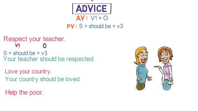 In this video, we will learn how to convert an active to passive voice in case of an imperative sentence. What is an imperative sentence. An imperative sentence is used to give the command or advice or request. In case of imperative sentences having command, the structure of the active voice is v1 + O. Converting it to passive voice, the structure becomes: Let + O + be + v3 In case of imperative sentences having advice, the structure of the active voice is v1 + O. Converting it to passive voice, the structure becomes: S + should be + v3 In case of imperative sentences having request, the structure of active voice is: please/kindly + v1 + O Converting it to passive voice, the structure becomes: You are requested to + v1 + O Exercise : Close the door. Respect your elders. please do this work. Please watch the entire video to practice the examples related. Active and Passive Voice video links : Active vs Passive Voice | Part 1 https://www.youtube.com/watch?v=nXQkFacZvS4&list=PLMfo9NXs6ZfHpKWcK9k9Fl-_7k7N9D4WK&index=1 Convert Active Voice to Passive Voice | Eight types | Based on Tenses | Part 2 https://www.youtube.com/watch?v=nXNFyY7xe8I How to convert active to passive voice | Interrogative Sentence | Seven Steps | Part 3 | Examples | Exercise | part 3 https://www.youtube.com/watch?v=Xh4u-VxjETA Convert active to passive voice | Interrogative Sentence | WH Words | Part 4 | Examples | Exercise https://www.youtube.com/watch?v=3iMo_49fztY&t=221s Please watch the videos from below Playlist for understanding Various Grammar Topics: Grammar Basics | Parts of Speech | https://www.youtube.com/playlist?list=PLMfo9NXs6ZfHIcdGPq4TtfPxRm873Bh0r Tenses | Advanced Grammar | Animated videos https://www.youtube.com/playlist?list=PLMfo9NXs6ZfF8BR44-taFznyxImfsuvEa Active Passive Voice | English Grammar https://www.youtube.com/playlist?list=PLMfo9NXs6ZfHpKWcK9k9Fl-_7k7N9D4WK Grammar Basics | Sentences https://www.youtube.com/playlist?list=PLMfo9NXs6ZfE7QJR40Pm-9MuW5CXyDsrl Direct Indirect Speech | Advanced Grammar https://www.youtube.com/playlist?list=PLMfo9NXs6ZfGK9jc6rkckbkZd-c8EWN0I Important Grammar Lessons https://www.youtube.com/playlist?list=PLMfo9NXs6ZfHL0qO1S4GGEmHEHnL5-2vI Articles In English https://www.youtube.com/playlist?list=PLMfo9NXs6ZfHwLBbn0tS9JVJ3-ANKEzmZ Figure of Speech https://www.youtube.com/playlist?list=PLMfo9NXs6ZfGWiCV-iK2DZyOFTSiRr15b Writing Skills https://www.youtube.com/playlist?list=PLMfo9NXs6ZfGa3qqm6GS98sMsBqkQy5-a Exam Preparation Tips https://www.youtube.com/playlist?list=PLMfo9NXs6ZfHkvD8makTKG5yiXZJESoMX Subject-AdVerb Agreement https://www.youtube.com/playlist?list=PLMfo9NXs6ZfEJ7dC3Jmo9msElpH1nop46 Modifiers https://www.youtube.com/playlist?list=PLMfo9NXs6ZfGWh1EmjHTEeTr_VI6VkJ0x