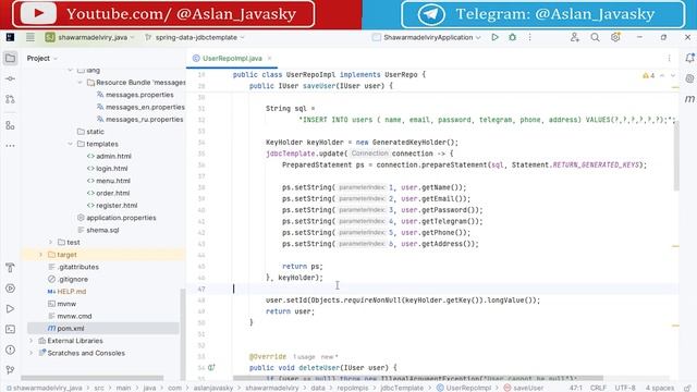 Задонатить: https://yoomoney.ru/to/4100110584940159 Курс по Spring framework на языках Java/Kotlin на примере разработки клиент-серверного приложения для заказа шаурмы) Исходный код ко всем урокам по модулю "JDBC Template" (JdbcTemplate/NamedParameterJdbcTemplate): https://github.com/AslanJavasky/shawarmadelivery_java/tree/spring-data-jdbctemplate https://github.com/AslanJavasky/shawarmadelivery_kotlin/tree/spring-data-jdbctemplate Задонатить преподавателю: Карта Сбер: 5469 6000 2144 3601 (Аслан) Карта Т-Банк: 2200 7001 1633 9259 (Аслан) Карта Альфа-Банк: 2200 1523 1074 7517 (Аслан) ЮMoney(ЯндексДеньги): 4100110584940159 для донатов из-за рубежа: https://www.donationalerts.com/r/aslan_javasky Спасибо :) Без VPN: https://vkvideo.ru/playlist/-229755761_3