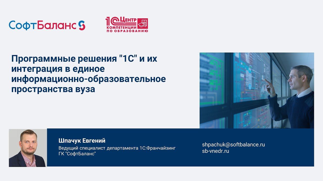 ГК "СофтБаланс" https://sb-vnedr.ru/ Программные решения "1С" и их интеграция в единое информационно-образовательное пространства вуза: общий обзор Внедрение 1С Университет https://sb-vnedr.ru/programm/1c-obrazovat/1c-universitet-prof/ Внедренные проекты в сфере образования https://sb-vnedr.ru/vnedrenie-1c/obrazovanie/ https://youtu.be/QzGffTY4808