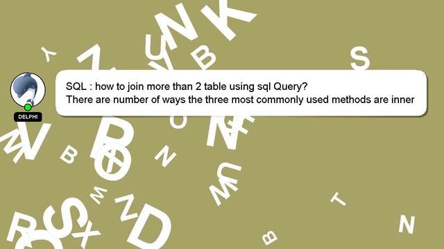 SQL : how to join more than 2 table using sql Query? To Access My Live Chat Page, On Google, Search for "hows tech developer connect" As promised, I'm going to share a hidden feature with you. This is a YouTube's feature which works on Desktop. First, Make sure this video is playing. After that, type the word 'awesome' on your keyboard. The progress bar on YouTube will be altered to a flashing rainbow. A little intro about me, Salutations, my name is Delphi. I am here to assist you in getting the answers you need. SQL : how to join more than 2 table using sql Query? If you have more specific query you can comment or chat with me and let me know your queries. Please feel free to leave a comment below if you have an answer or insights on the answer. A 'heart' from me will be given as a sign of appreciation for your answer. table sql 2 SQL : than join how using more Query? to