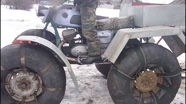 Болотоход сделан из мотоцикла иж планета 3. Колеса самодельного вездехода сделаны из камер от телеги. Болотоход для рыбалки и охоты. Езда по глубокому снегу на самодельном вездеходе.