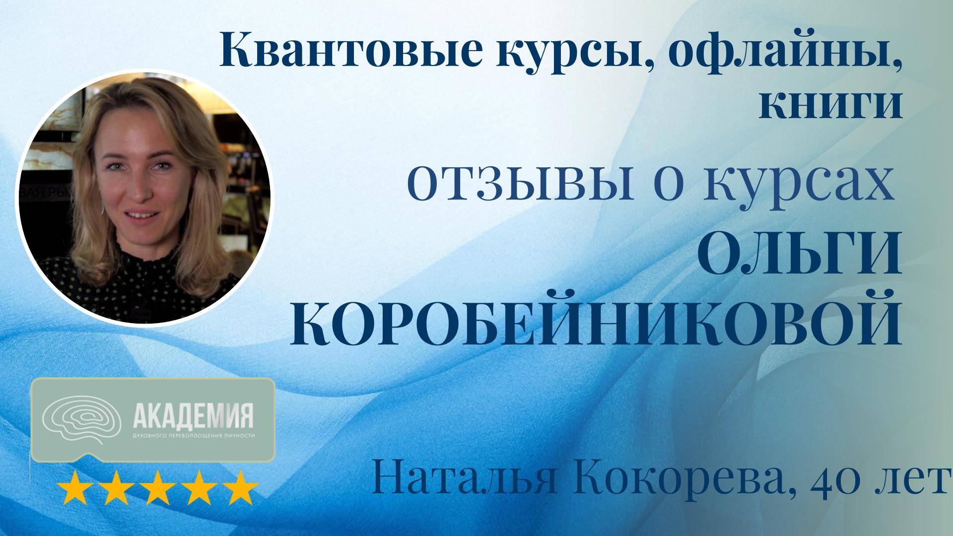 Отзывы о курсах Ольги Коробейниковой: "Квантовые курсы", офлайн-сессии, книги 73. Наталья Кокорева, 40 лет - Курсы: Квантовые курсы, офлайн-сессии, книги Наталья обратилась к курсам с желанием развить осознанность и почувствовать глубокую связь с собой. - Путь к изменениям Находясь в «Поле Оли», Наталья ощутила мощное воздействие каждой клеточкой своего организма, что способствовало её личной трансформации. - Точка Б: Результаты после курсов Ольги Коробейниковой Наталья обрела состояние свободы и получила яркие осознания о своей энергии и своём месте в мире. Отзывы Натальи показывают, что курсы и книги Ольги Коробейниковой помогают участникам глубоко почувствовать себя, обрести свободу и понимание своей роли и энергии в мире.