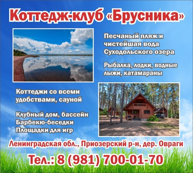 Коттедж-клуб "Брусника": отдых в коттеджах на берегу Суходольского озера, в Приозерском районе Ленинградской области. Коттедж-клуб "Брусника" находится в одном из красивейших мест Карельского перешейка. Коттеджный поселок, в котором располагается коттедж-клуб "Брусника" имеет собственный пляж на берегу Суходольского озера (от наших коттеджей до берега 350 м). К Вашим услугам: - Песчаный пляж с чистейшей водой Суходольского озера. Можно взять в аренду водные лыжи, катамаран или лодку. - Шесть деревянных коттеджей, оборудованных современной бытовой техникой, компактной сауной на четырех человек, уютной мебелью и дровяным камином. - Финская сауна в каждом коттедже. - Барбекю-беседки - место для ваших посиделок и приготовление пищи на углях. - Детская площадка - безопасное место где ваши дети смогут поиграть самостоятельно. - 25 метровый бассейн. - Площадки для игр в мини-гольф, волейбол, бадминтон - Клубный дом, где для вас: настольный теннис, настольные игры, дартс, стол для армрестлинга. - Аренда велосипедов - Рыбалка в любое время года Ленинградская обл., Приозерский р-н, 77 километр а/д Сортавала, деревня Овраги Телефон: 8 (981) 700-01-70 Сайт: brusnika-club.ru ВКонтакте: vk.com/cottagebrusnika Координаты: Долгота: 30°3′20.16″ в. д. (30.053313) Широта: 60°40′54.17″ с. ш. (60.682159) #коттеджклуб #Приозерскийрайон #отдыхвкоттедже #Суходольскоеозеро #Ленинградскаяобласть #отдыхвкоттеджеуозера #СанктПетербург #отдыхуозера