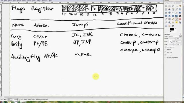 In this, the 19th, tutorial we're going to be looking at the FLAGs register. We will only cover the general purpose programming flags here but there's many more for system programming and debugging. The Flags register is a collection of bits which describe the results of previous instructions. For instance, if you subtract a register from another and end up with zero, the Zero flag will become 1. If you add 1 to a byte which has 255 in it, the Carry flag will be set. You can use the bits in the Flags register to conditionally jump to labels with the conditional jumps. Sometimes you'll see the conditional jumps collectively written as Jcc. For instance JNZ means jump to the label only if the Zero flag is not set. JZ means jump only if the Zero flag is a 1. There are many conditional jumps but these ones and those from tutorial 8 I think cover almost all of them. In addition to having a conditional jump for most of these flags there are also conditional moves, sometimes written as CMOVcc. They begin with CMOV, for conditional move. After the CMOV you have the same letters as are present in the corresponding Jumps. If the condition being tested is true, the source operand (Op2) is moved into the destination (Op1) otherwise the destination is left untouched. The conditional moves are very important in optimization. If you can it will almost always be quicker to replace the following: cmp ebx, eax jne DontSet mov ecx, ebx DontSet: With a much faster conditional move: cmp ebx, eax ; Set the flags register cmovne ecx, ebx ; Move ebx into ecx if ebx != eax The conditional moves remove any chance of the CPU mispredicting a branch by removing the branch. Also, I've neglected to mention but we really shoudn't assume our CPU can do conditional moves, we should be calling CPUID first, more on this later.