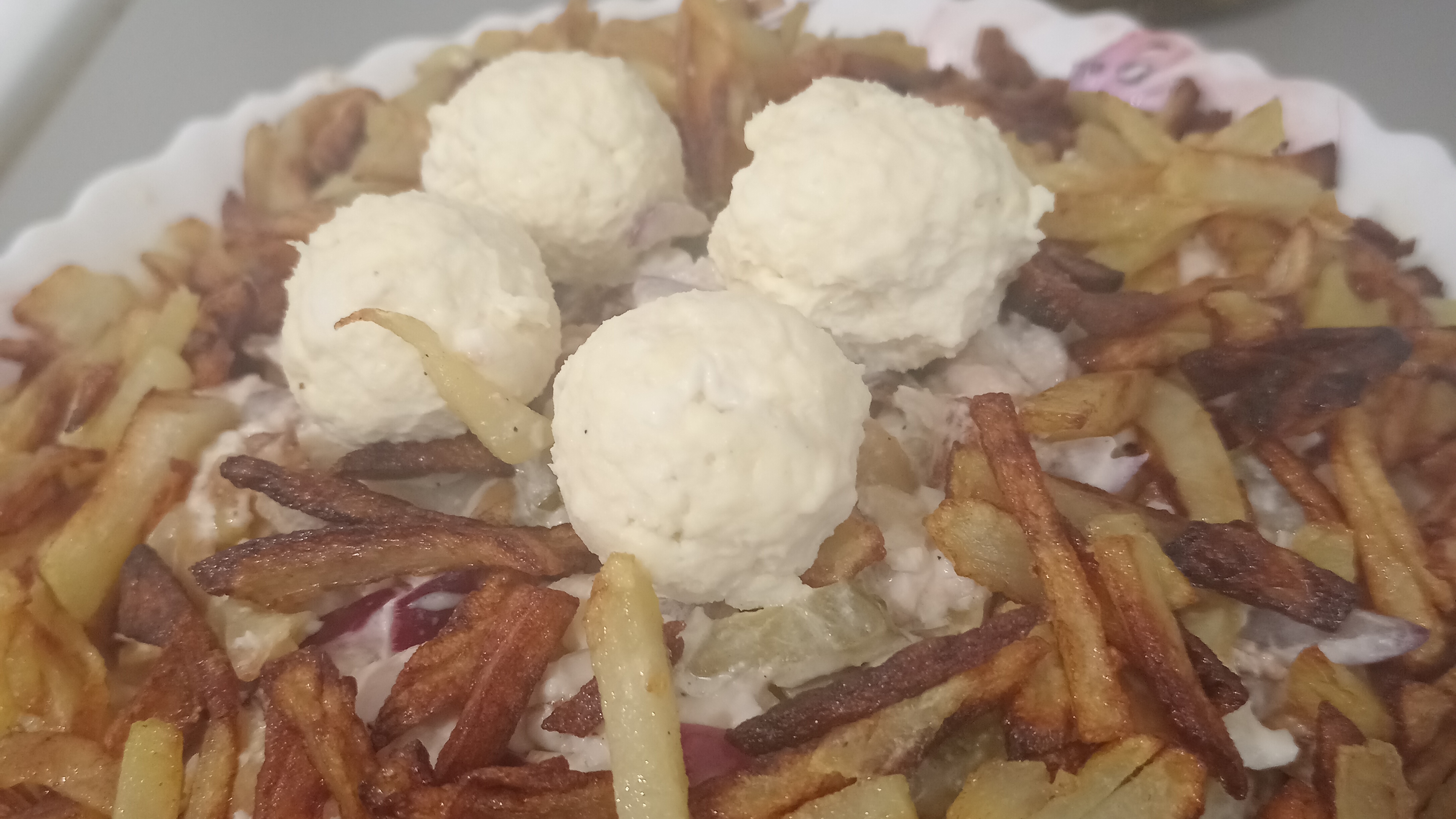 Версий этого вкуснейшего салата много, мне нравится так-куриное филе помаринуем в сметане, картофель обжарим соломкой(Пай суховатый выходит), перепелиные яйца заменим желтками☺️