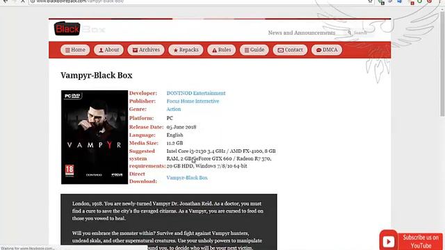 HELLO & WELCOME TO GAMING CHANNEL In This Video i am going to show you How to Download (Vampyr-Black Box) Repack on PC Without anyProblems or Errors :::Vampyr-Black Box::: I GIVEN LINK IN description https://openload.co/f/ctT086mez4M/BB-VM5R-TT.rar Minimum requirements: Developer: DONTNOD Entertainment Publisher: Focus Home Interactive Genre: Action Platform: PC Release Date: 05 June 2018 Language: English Media Size: 11.2 GB Suggested system requirements: Intel Core i3-2130 3.4 GHz / AMD FX-4100, 8 GB RAM, 2 GB GeForce GTX 660 / Radeon R7 370, 20 GB HDD, Windows 7/8/10 64-bit Direct Download: Vampyr-Black Box #INSTAGRAM https://www.instagram.com/nahraf9966/?hl=en #TWITTER https://twitter.com/FARHAN99664/media #FACEBOOK https://www.facebook.com/cec.cedcd.1 If you really like this video then don't forget to like it.Share, Support, Subscribe!!! .Thanks For watching.