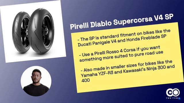 Pirelli's tyre for fast road-riding nutters or trackday purists who like to ride their road-legal - mirrors, number plate and indicators - bike to the track, smoke a few trackbikes and ride home again, via the Little Chef. See user reviews and more information on the Pirelli Diablo Supercorsa V4 SP here: https://www.twotyres.co.uk/product/pirelli-diablo-supercorsa-v4-sp/ Need new tyres? Check out our tyre finder here: https://twotyres.co.uk/motorcycle-tyre-finder/?utm_source=YouTube&utm_medium=description&utm_id=YT60SG