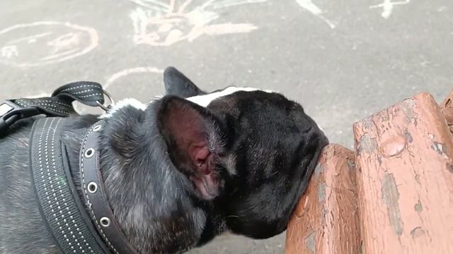 Бульдог Финя любит грызть скамейки. 11 июня 2022