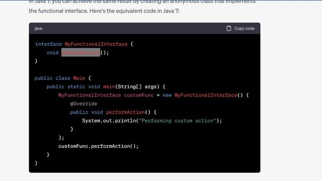 Functional Interface in Java 7 and Java 8 with real world example code June 2023 interview java 8 CustomFunctionalInterface customFunc = () ---System.out.println("Performing custom action"); customFunc.performAction(); ------------------------------------------------------------------------------------------------- java 7 MyFunctionalInterface customFunc = new MyFunctionalInterface() { @Override public void performAction() { System.out.println("Performing custom action"); } }; customFunc.performAction();