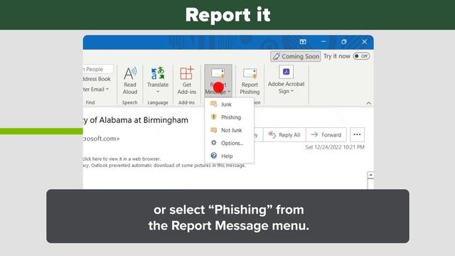 Reporting a phish helps UAB IT more quickly respond to these malicious emails — and protect your accounts, research and data. Contents of this video 0:00 - Intro 0:26 - UAB's new Report Phishing button 0:49 - Mac desktop app 1:00 - Windows desktop app 1:12 - Windows web version 1:38 - iPhone 1:48 - Android 2:01 - Outro Find out more about UAB's new button: https://www.uab.edu/it/news/item/report-a-phish-quickly-with-outlook-button