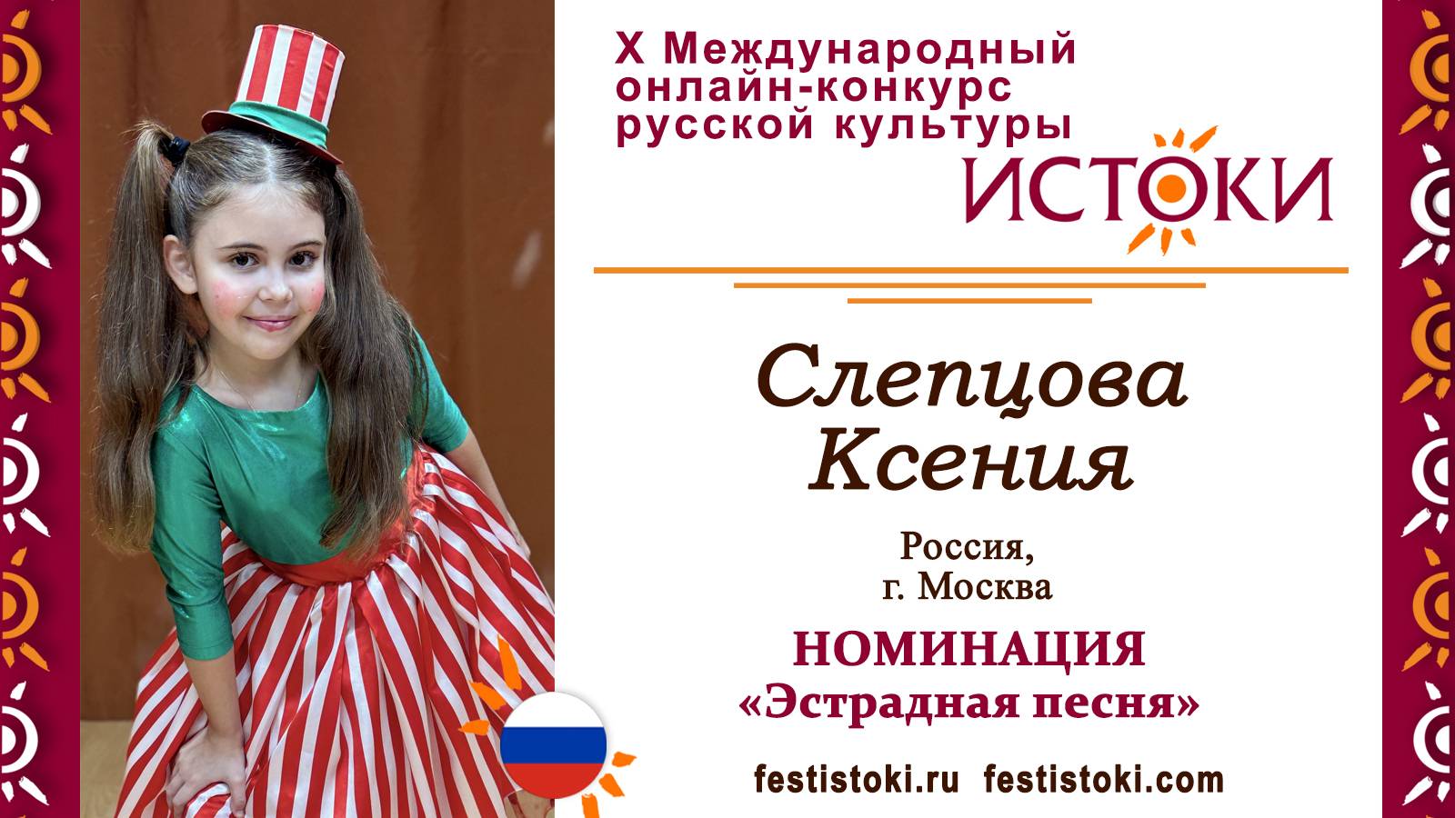 Участник Х Международного онлайн-конкурса русской культуры "Истоки". Номинация "Эстрадная песня". Песня "Арлекино". Авторы Б.Баркас, Э.Димитров. Сайт: festistoki.ru / festistoki.com E-mail: festistoki@mail.ru